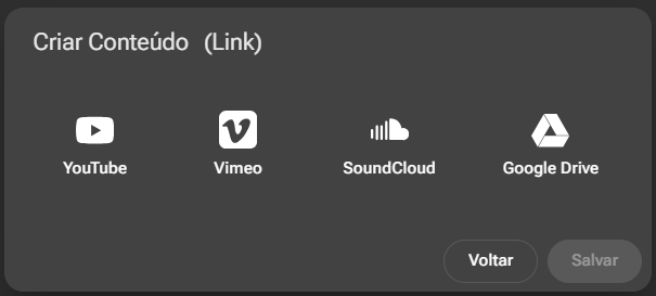 LINK: Conteúdos hospedados em sites terceiros, como o YouTube, Vimeo, SoundCloud e Google Drive, que dependem de um link para visualização.